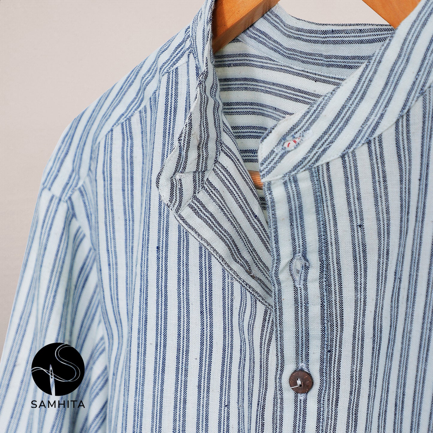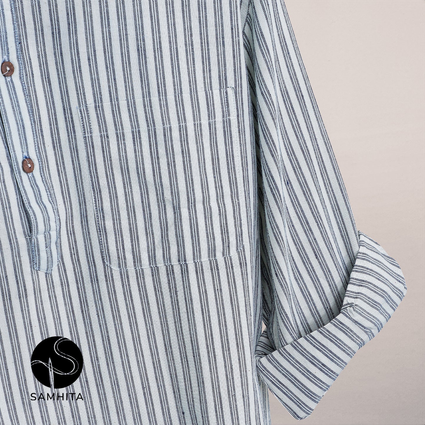 Men's Off-White and Indigo Blue stripe Khadi Cotton Short Kurta (MK 104 A)