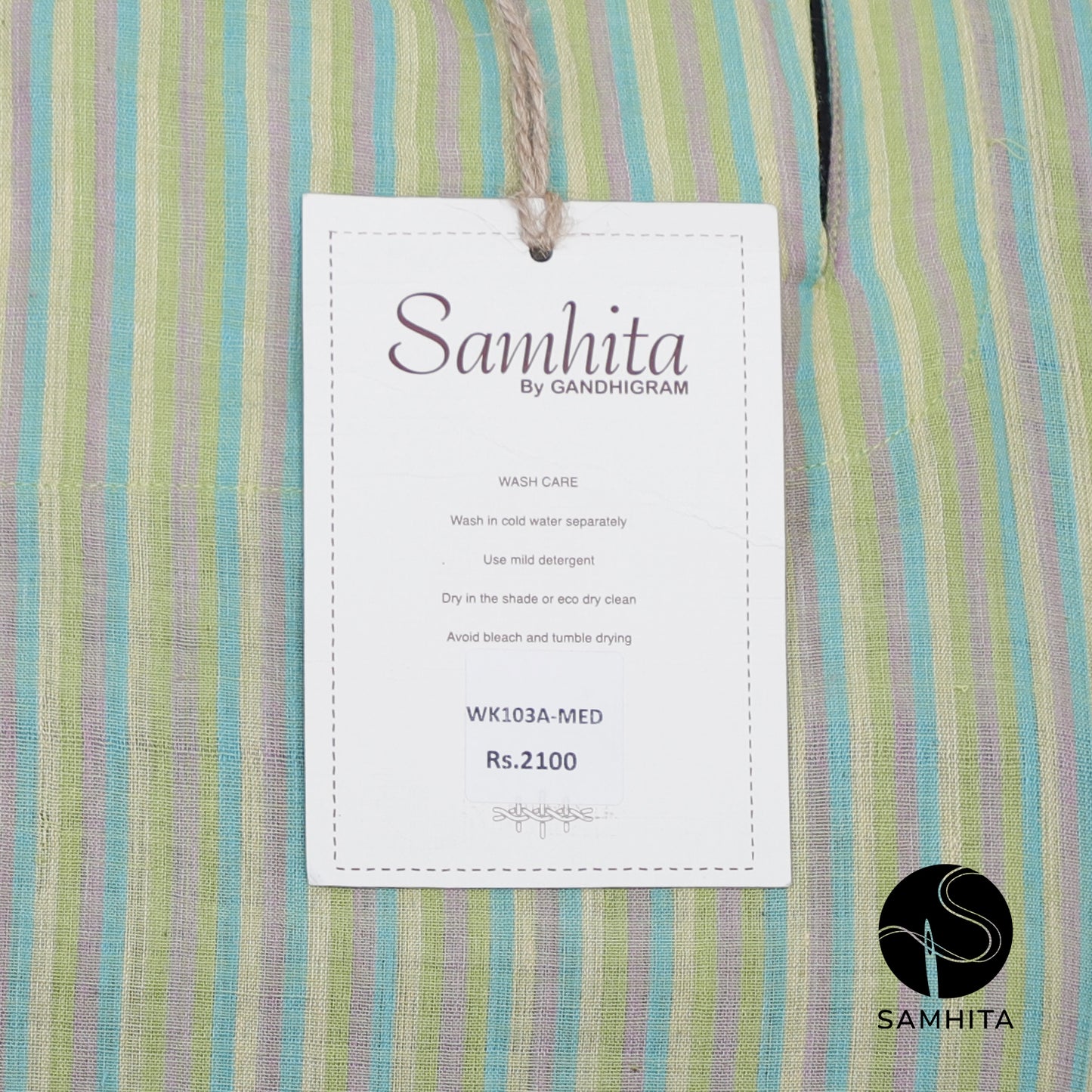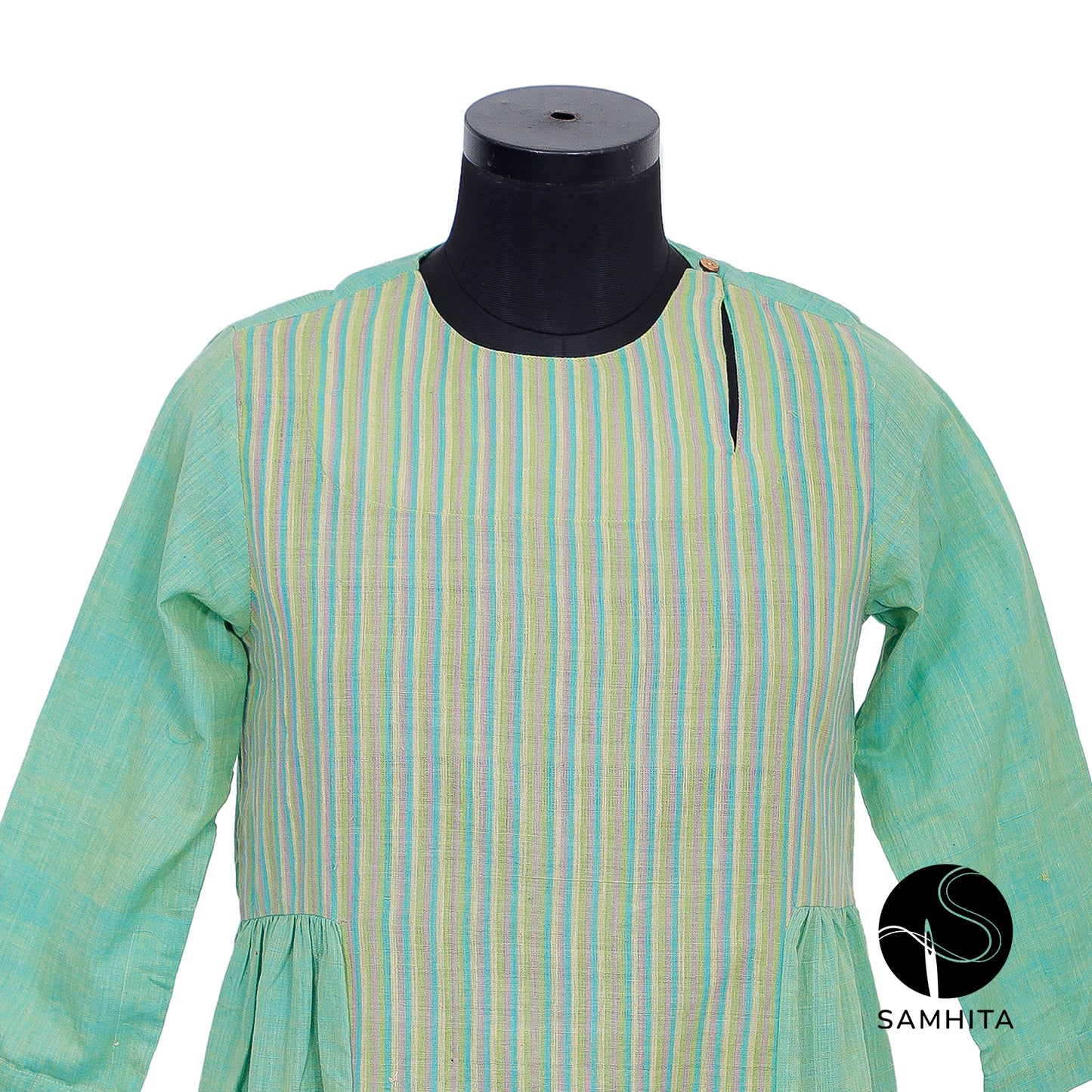 Handwoven in soft cotton khadi, this pastel green dress features delicate stripes and a gathered waist for a relaxed, elegant look. Perfect for casual comfort with a touch of charm.