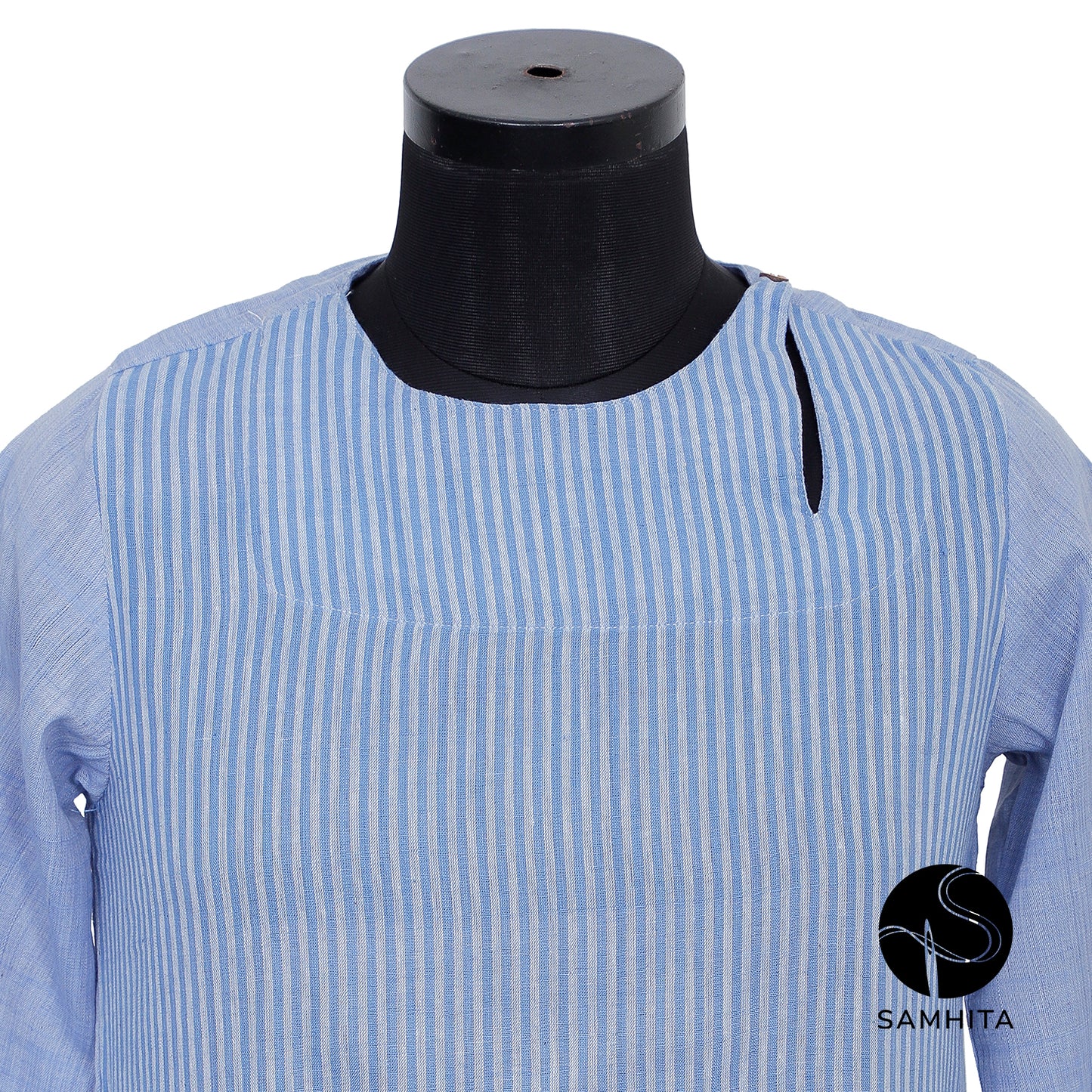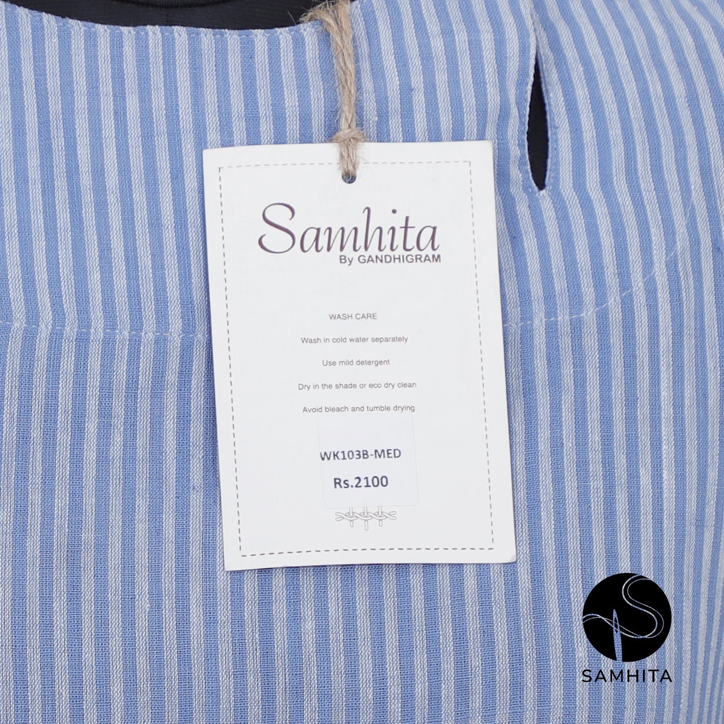 Handwoven in soft cotton khadi, this pastel violet dress boasts subtle stripes and a gently gathered waist, creating a stylish silhouette. Ideal for effortless elegance with a hint of playful charm.