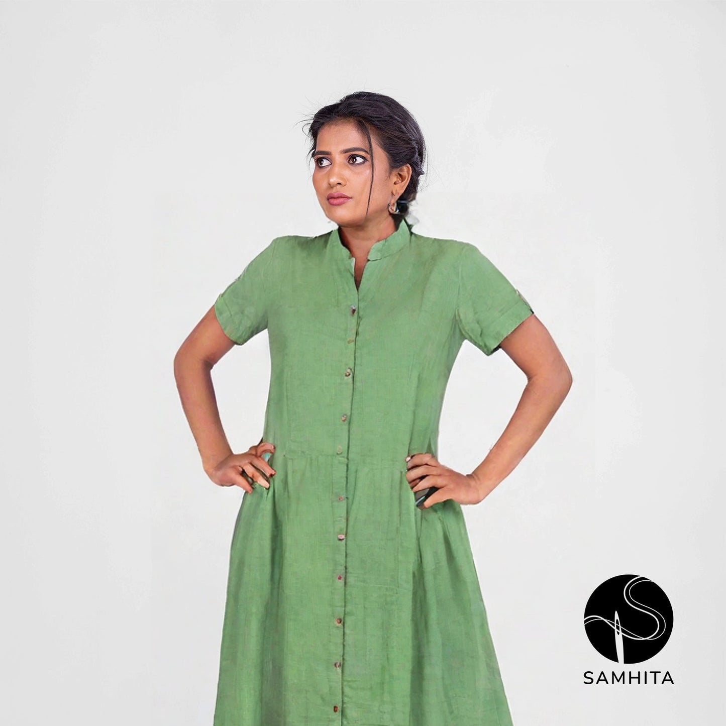 This green dress brings together comfort and style with a gathered waist for a flattering fit, short sleeves for ease, a button-down front for versatility, and a mandarin collar for a sleek finish.