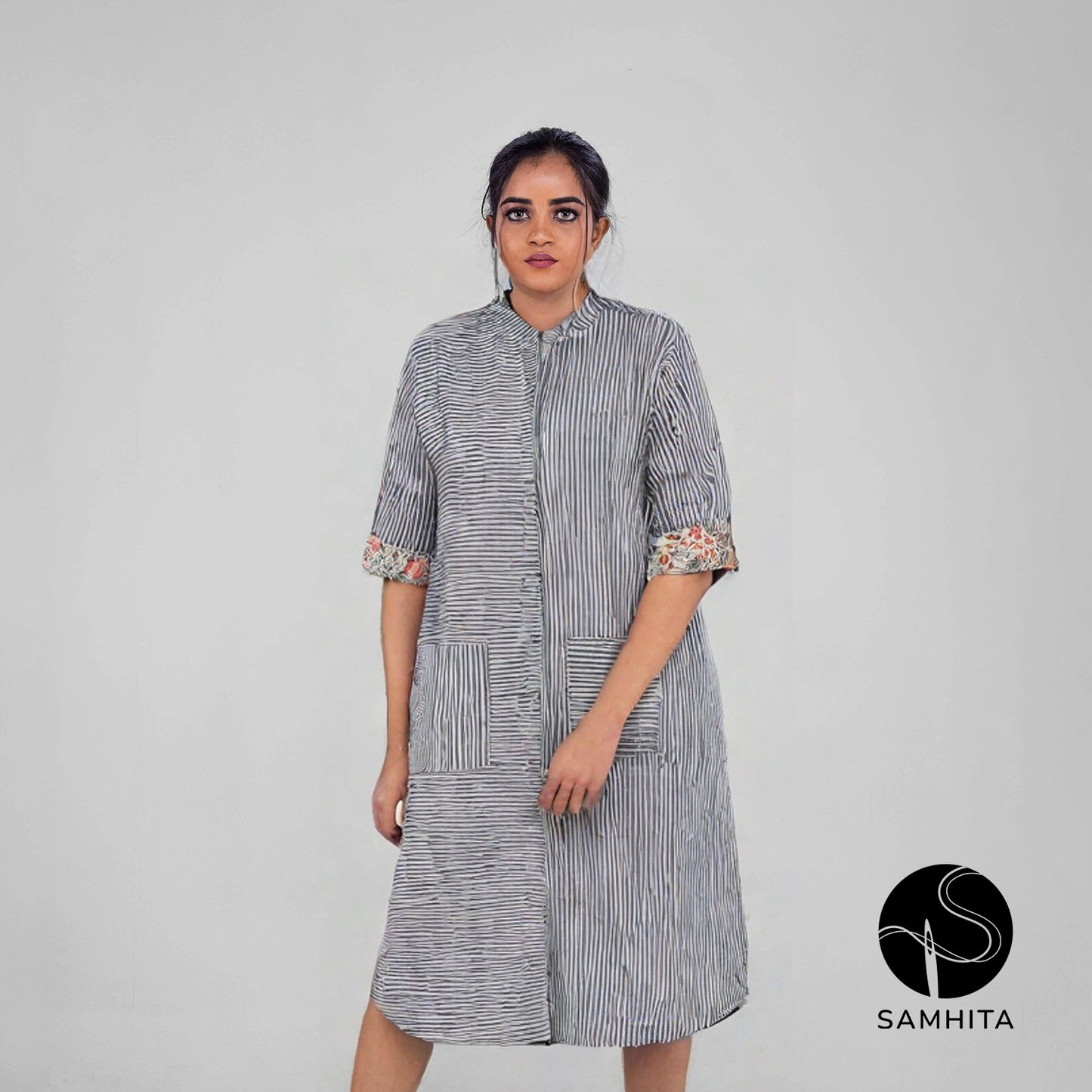 In soothing grey and white stripes, this dress is both versatile and stylish. The 3/4th sleeves with kalamkari detailing and functional pockets make it ideal for all-day wear.