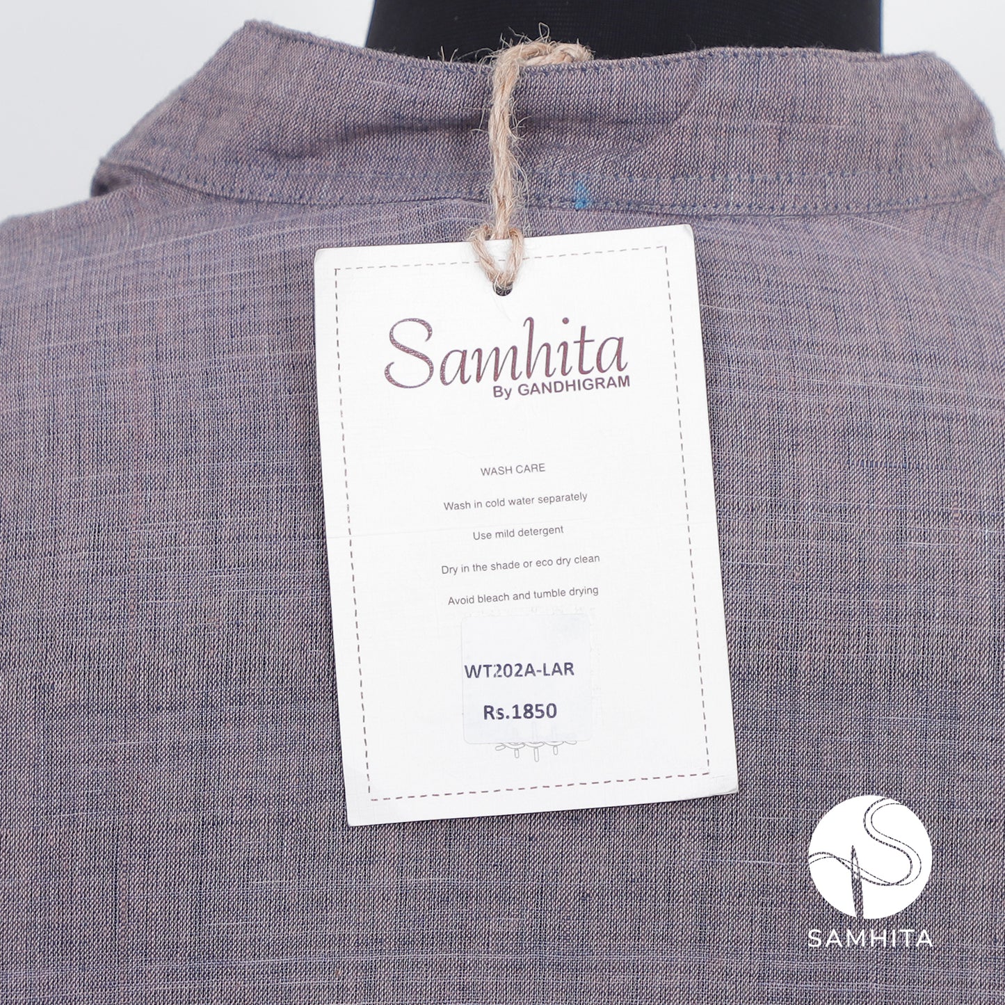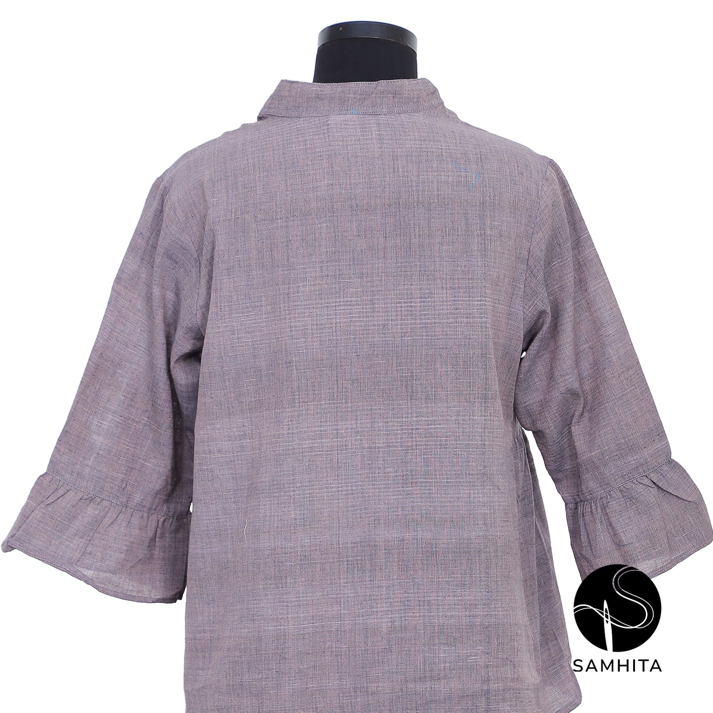 This textured grey khadi short top features a gathered waistline, flared 3/4th sleeves, and a button-down front. Its comfortable fit and subtle details make it a versatile choice for work or casual outings.