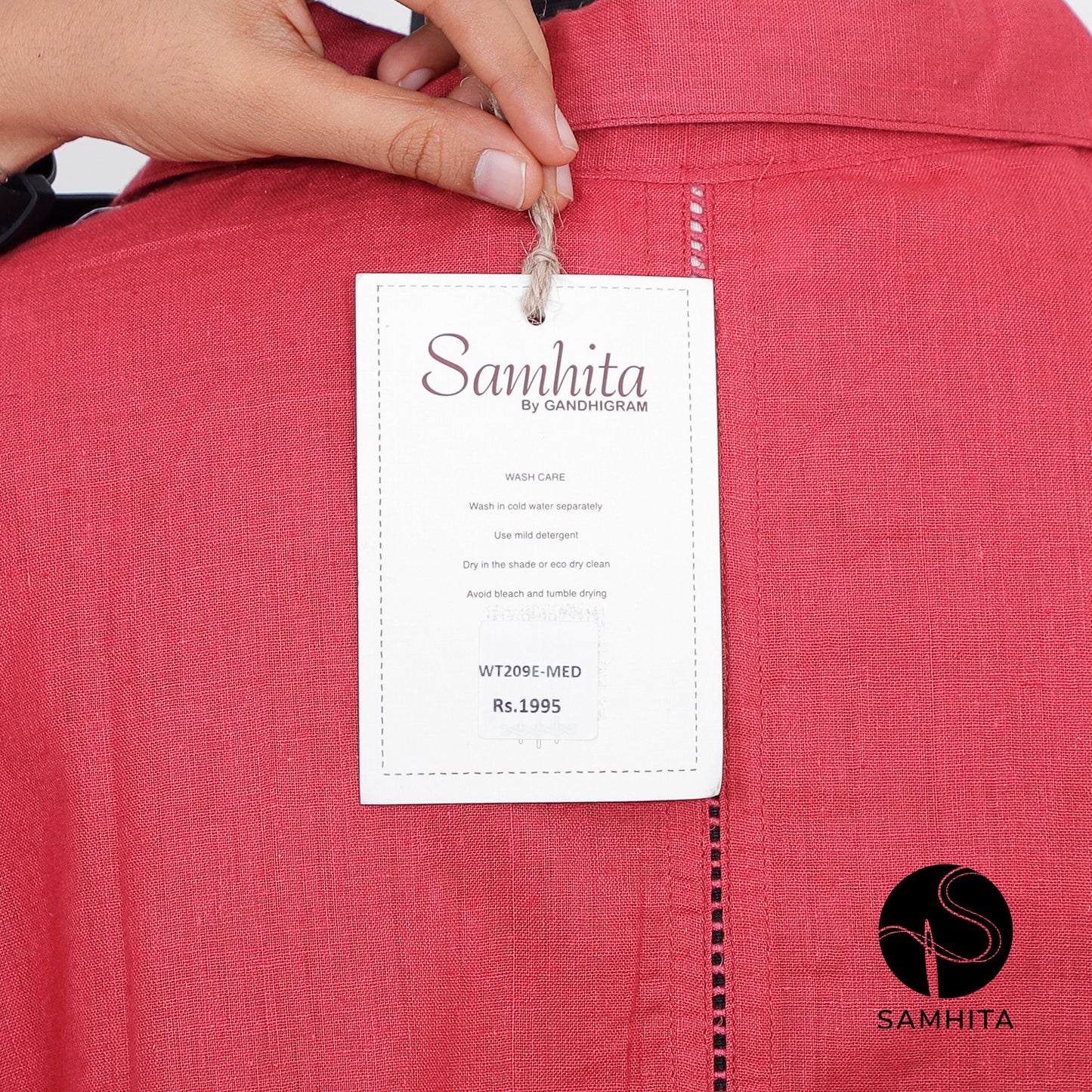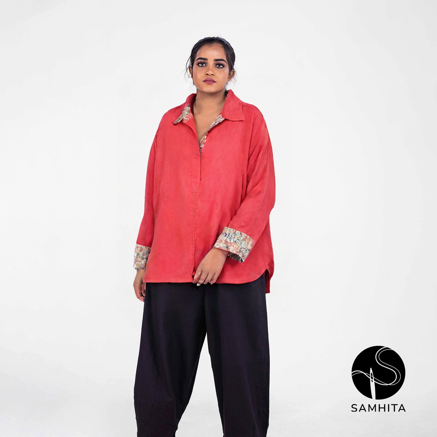 This red batwing shirt offers a cozy, oversized fit with a half placket and kalamkari contrast, making it both comfortable and eye-catching.