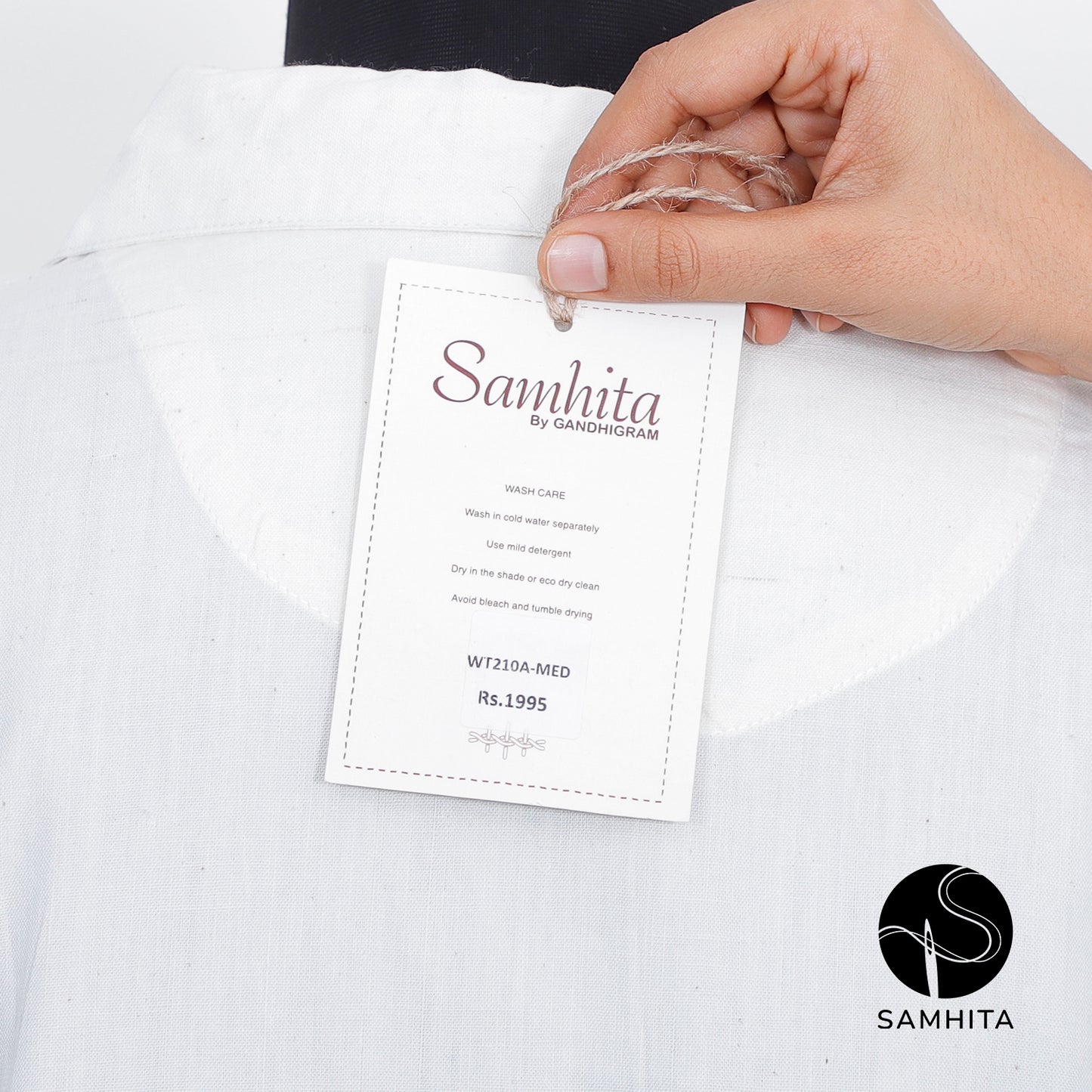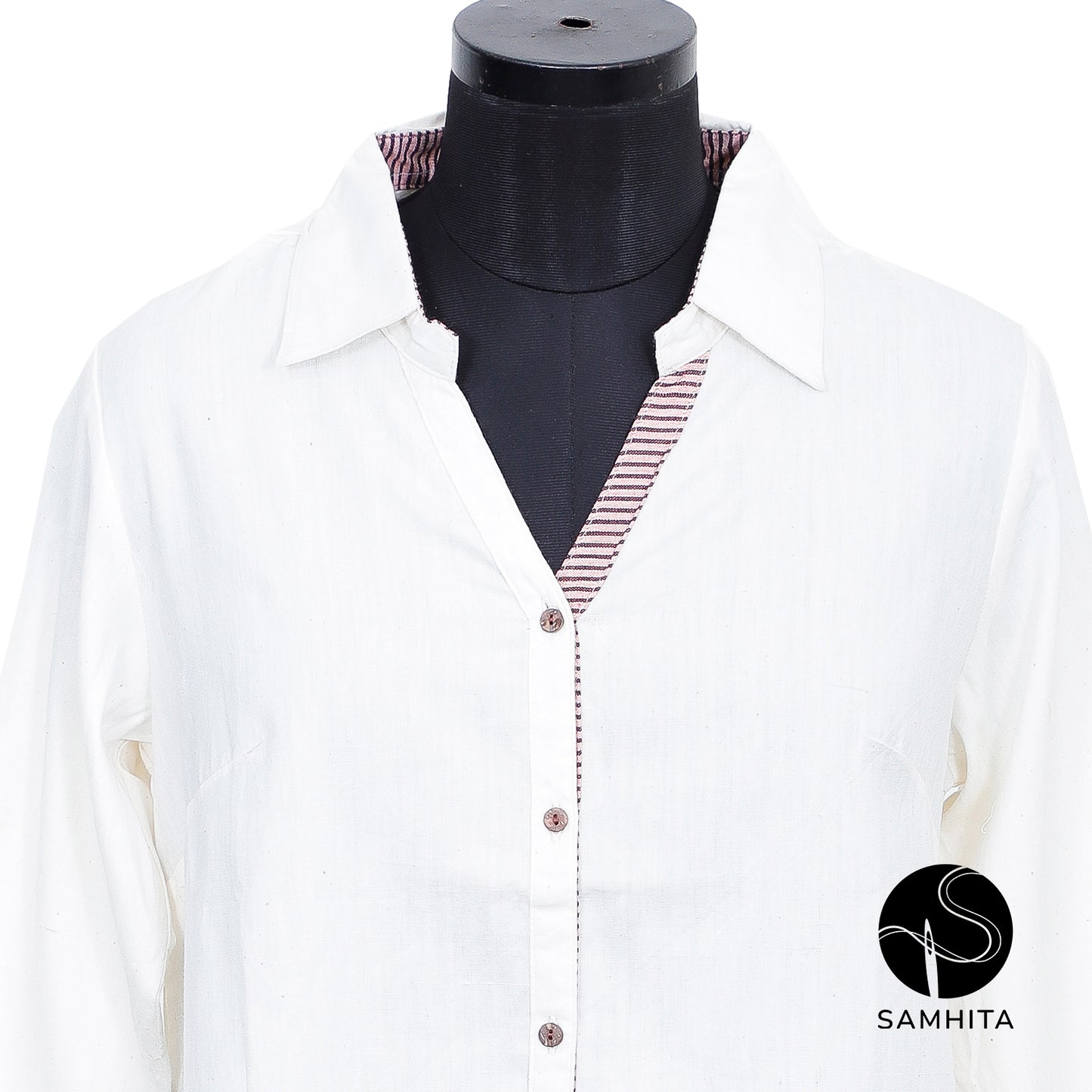 This white collared kurta in kora cotton, handwoven with care, features a subtle stripe highlight on the placket. A refined choice for effortless sophistication.