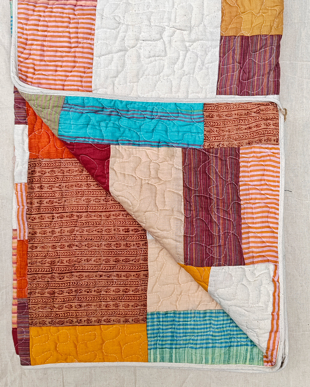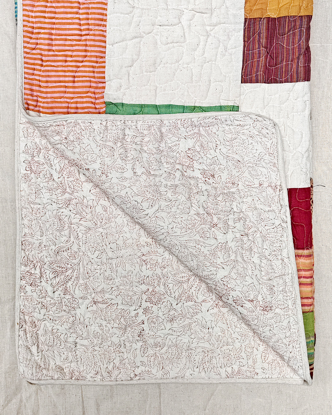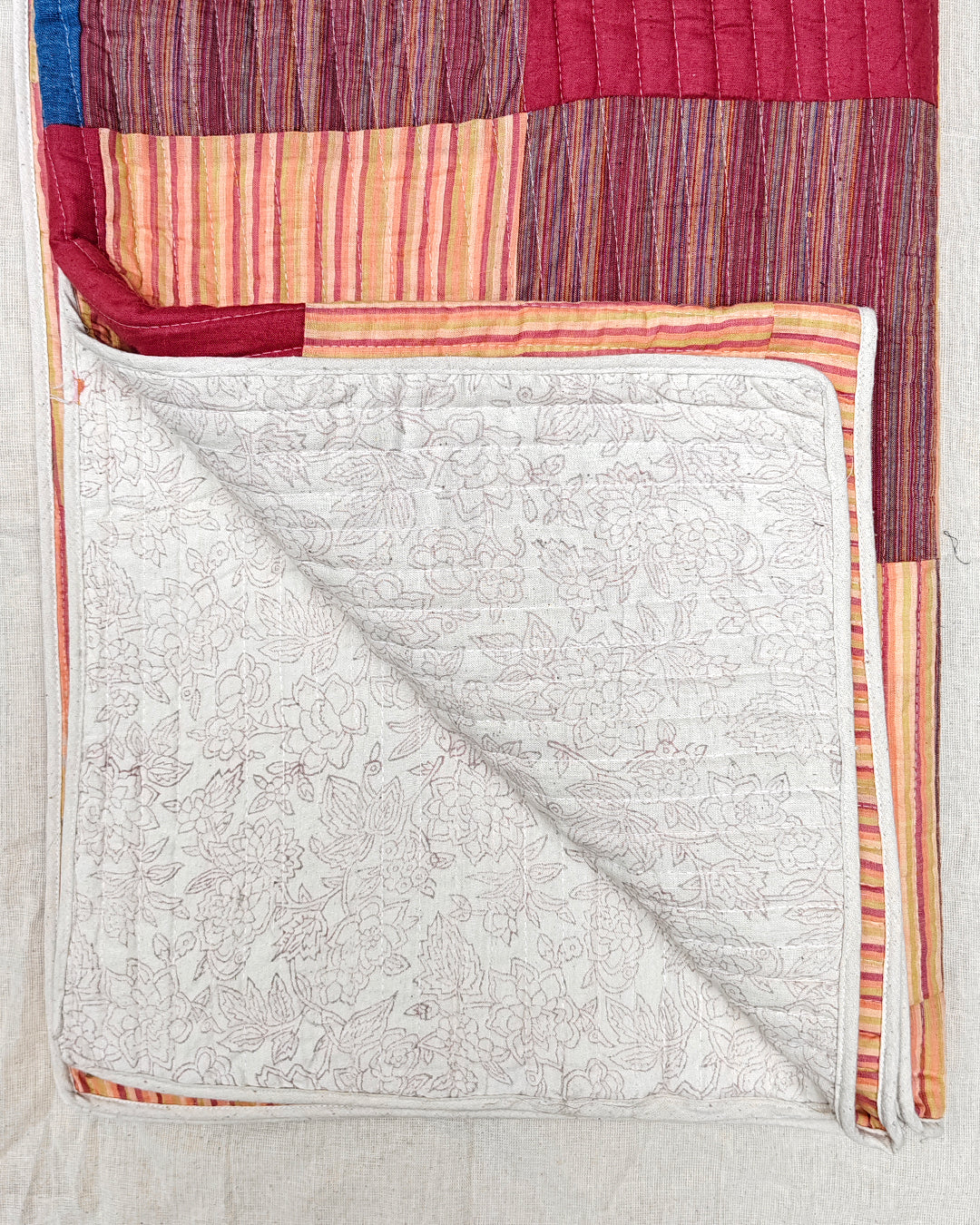 Front: Khadi Patchwork & Hand-Block Prints. The top layer is a stunning arrangement of Khadi fabric scraps, salvaged and stitched together to create a unique, sustainable design. Each patch is adorned with hand-block prints using intricate wooden blocks and Azo-free or natural dyes, ensuring every quilt is a one-of-a-kind masterpiece.