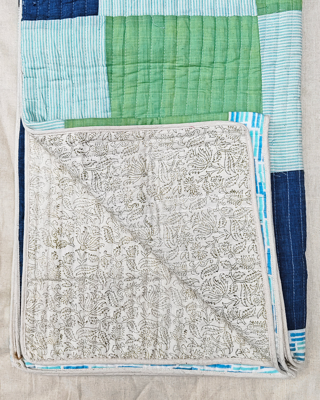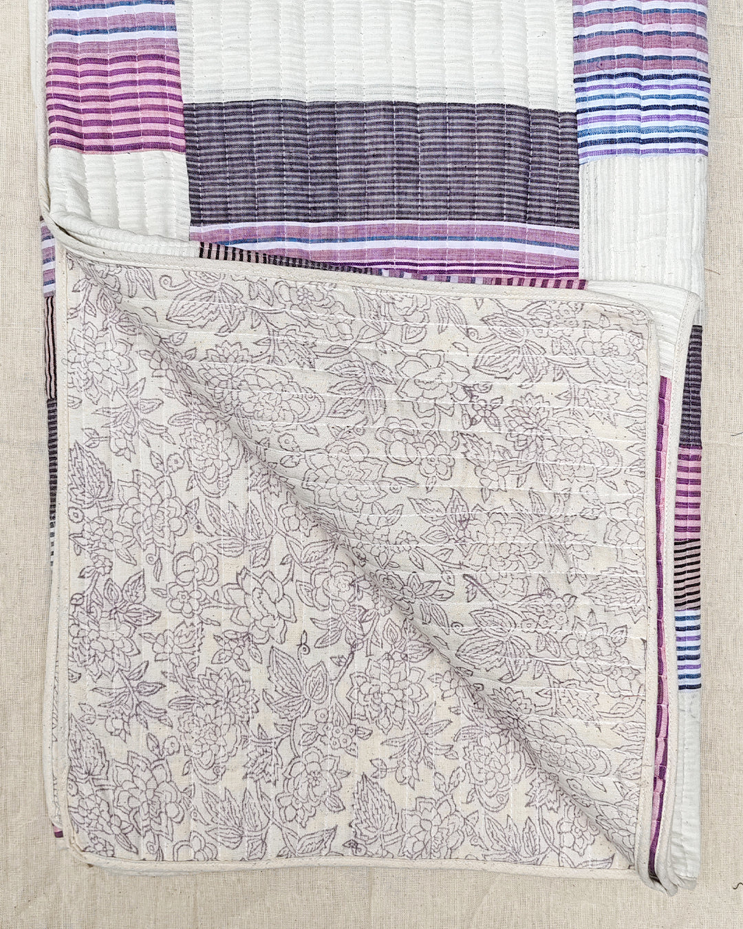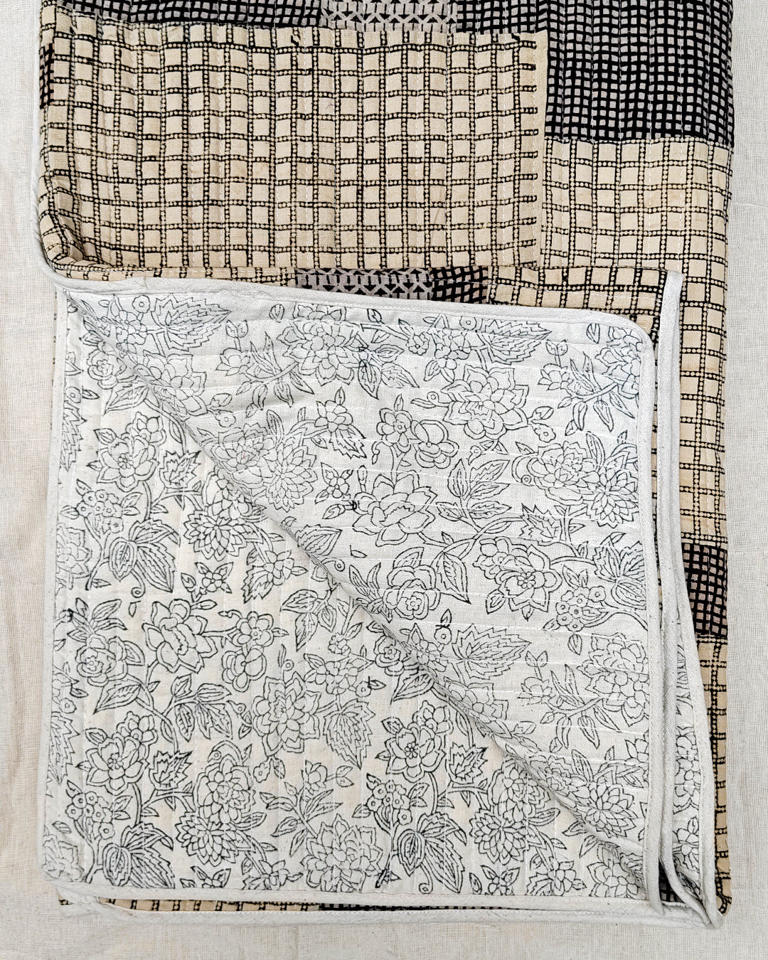 Front: Khadi Patchwork & Hand-Block Prints. The top layer is a stunning arrangement of Khadi fabric scraps, salvaged and stitched together to create a unique, sustainable design. Each patch is adorned with hand-block prints using intricate wooden blocks and Azo-free or natural dyes, ensuring every quilt is a one-of-a-kind masterpiece.