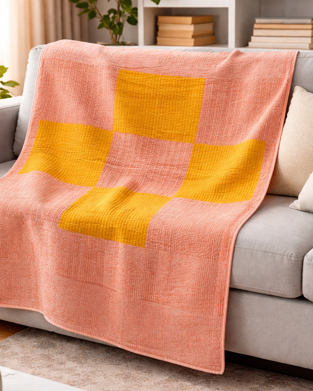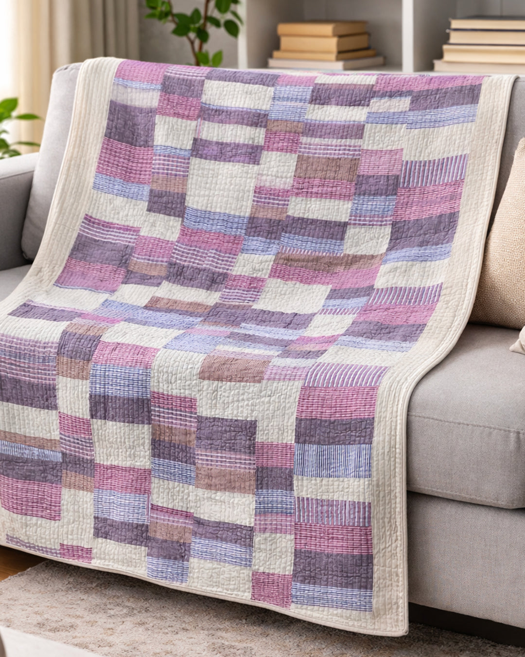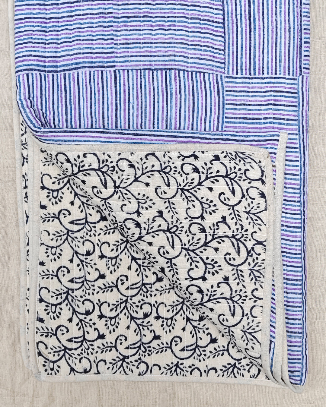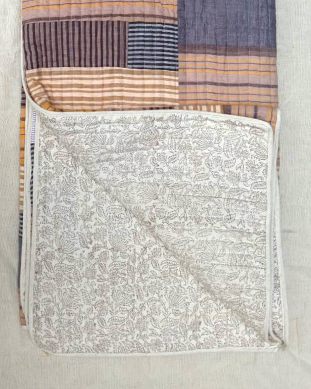 Each quilt is a labour of love, meticulously assembled at the Gandhigram weaving unit. Featuring a vibrant patchwork front and a breathable Kora back, these quilts offer a balanced weight that is perfect for year-round comfort.