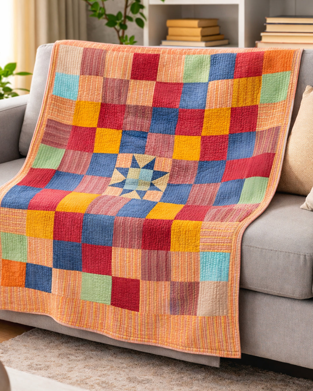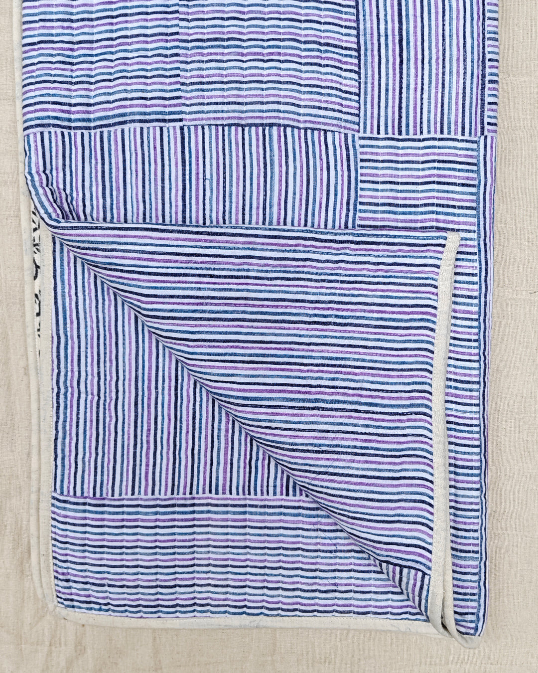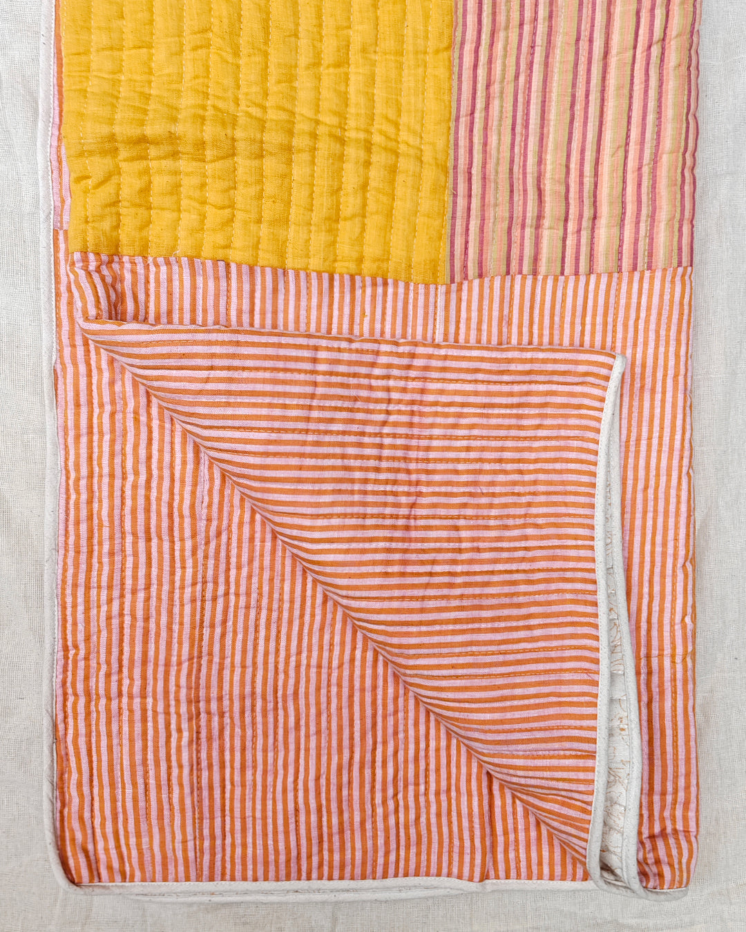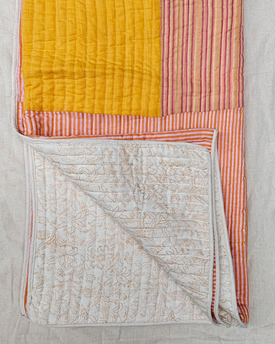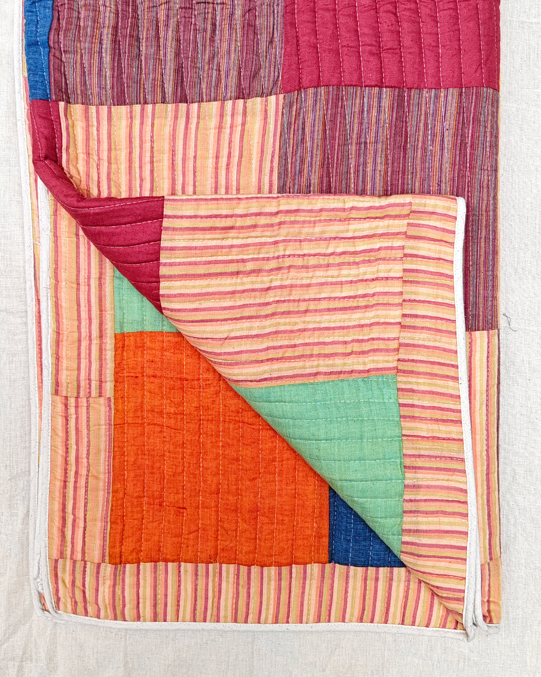 Each quilt is a labour of love, meticulously assembled at the Gandhigram weaving unit. Featuring a vibrant patchwork front and a breathable Kora back, these quilts offer a balanced weight that is perfect for year-round comfort.