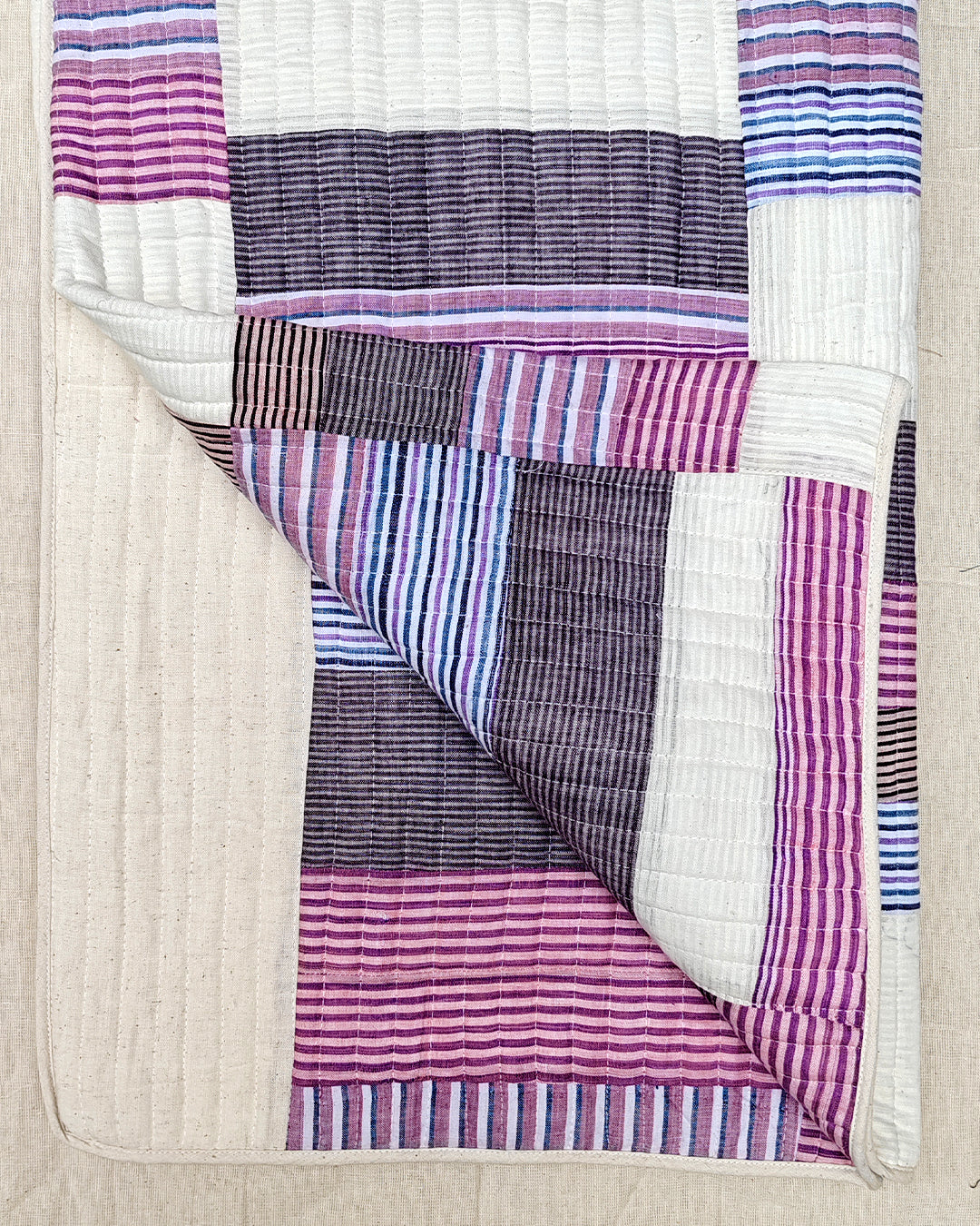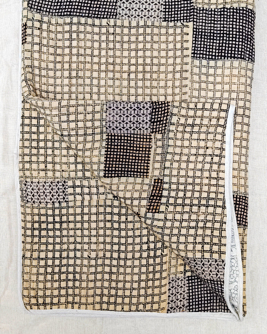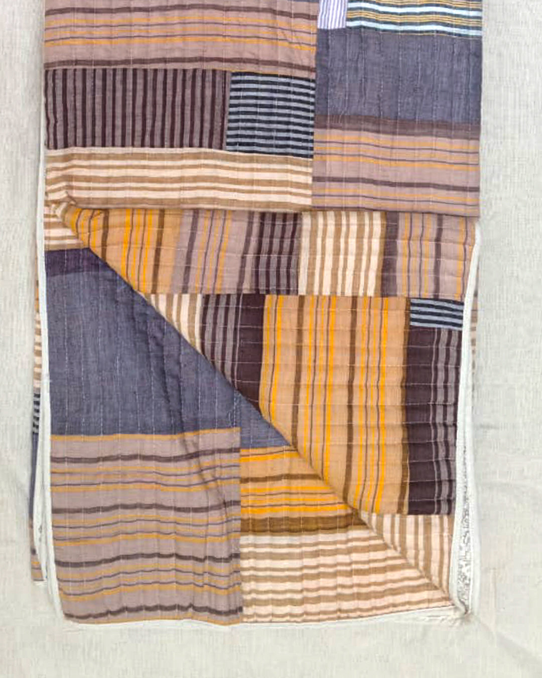 Back: Authentic Kora Khadi. The reverse side features the raw, unbleached beauty of Kora fabric. Soft yet durable, this skin-friendly backing provides a rustic, earthy feel against the skin and ensures the quilt remains slip-resistant on your bed.t